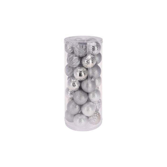 Set van 35 zilverkleurige kerstballen met een diameter van 6 centimeter, verpakt in een koker. De ballen hebben verschillende texturen waardoor ze zorgen voor visuele variatie in je kerstboom. Niet alleen zijn ze ideaal voor het versieren van je kerstboom, maar ook voor andere kerststukjes en kransen.