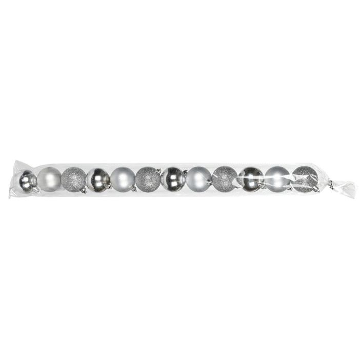 Set van 12 kerstballen in het zilver, met elk een diameter van 5 cm. De set bevat matte, glazende en glitter kerstballen.