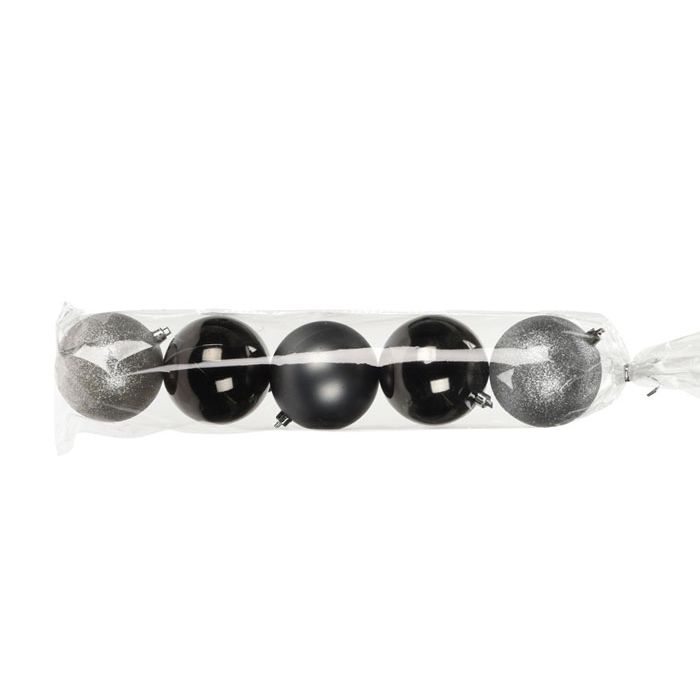 Set van 5 kerstballen in de kleuren zwart en zilver, met elk een diameter van 8 cm. De set bevat 1 matte, 2 glazende en 2 glitter kerstballen.