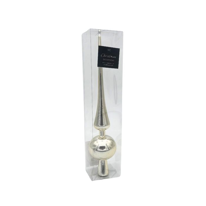 Creëer een feestelijke sfeer in huis door je kerstboom te voorzien van een prachtige piek. Deze kerstboompiek van 28 cm is vervaardigd uit plastic en veilig voor huishoudens met kinderen en huisdieren. De piek heeft een klassieke vorm en is voorzien van een chique kleur die neigt naar champagne, een combinatie van zilver en goud. De piek heeft een glanzende afwerking en kan eenvoudig op de hoogste tak van de kerstboom worden geplaatst.