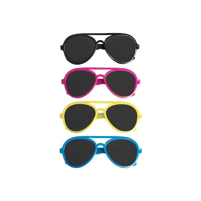 Stoere kinderzonnebrillen in verschillende kleuren. Leuk om uit te delen op een kinderfeestje. Een verpakking bevat vier zonnebrillen. Een zonnebril is circa 13,5 x 4,8cm groot. Let op: de kleuren van de zonnebrillen kunnen per verpakking verschillen.