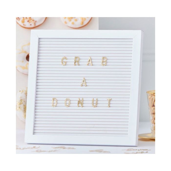 Witte letterbord van Ginger Ray om je gasten te informeren of bijvoorbeeld een drankenlijst weer te geven. Elke set bevat 1 letterbord en 161 gouden karakters. Het bord is 25 (l) x 2 (b) x 25 (h) cm groot.