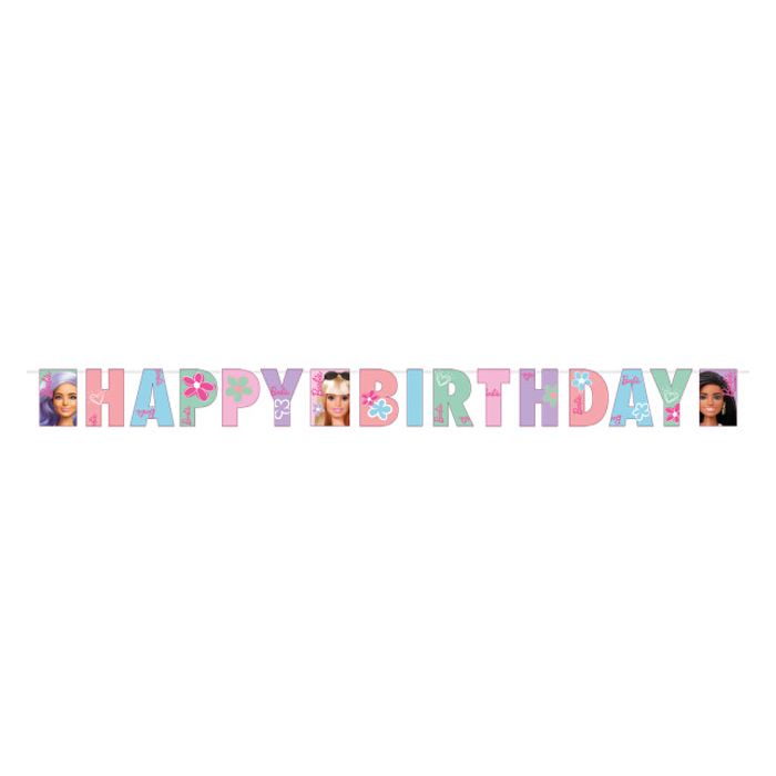 Vier je je verjaardagsfeestje in Barbie thema? Dan is deze Happy Birthday slinger in pastel kleuren perfect voor jou! De slinger is gemaakt van karton en heeft een afmeting van circa 180x15cm.