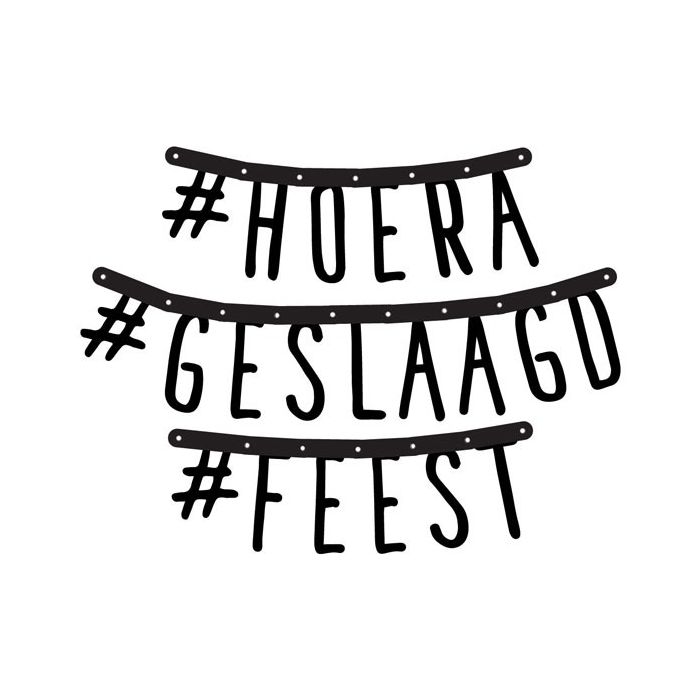 Zwarte letterslinger met de tekst '#HOERA #GESLAAGD #FEEST'. Perfect voor een 'Geslaagd' feestje!