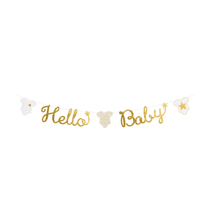 Prachtige letterslinger die de tekst 'Hello Baby' vormt in goude letters en drie afbeeldingen van een rompertje. De slinger is ongeveer 160cm lang.