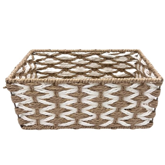 Grote, rechthoekige, handgeweven opbergmand met een afmeting van circa 27,5 x 18 x 11,5 cm (lxbxh), perfect voor moeiteloze organisatie. Ook verkrijgbaar in de volgende maten (klein en middel ): 20 x 10,5 x 9,5 cm en 23,5 x 15 x 10,5 cm