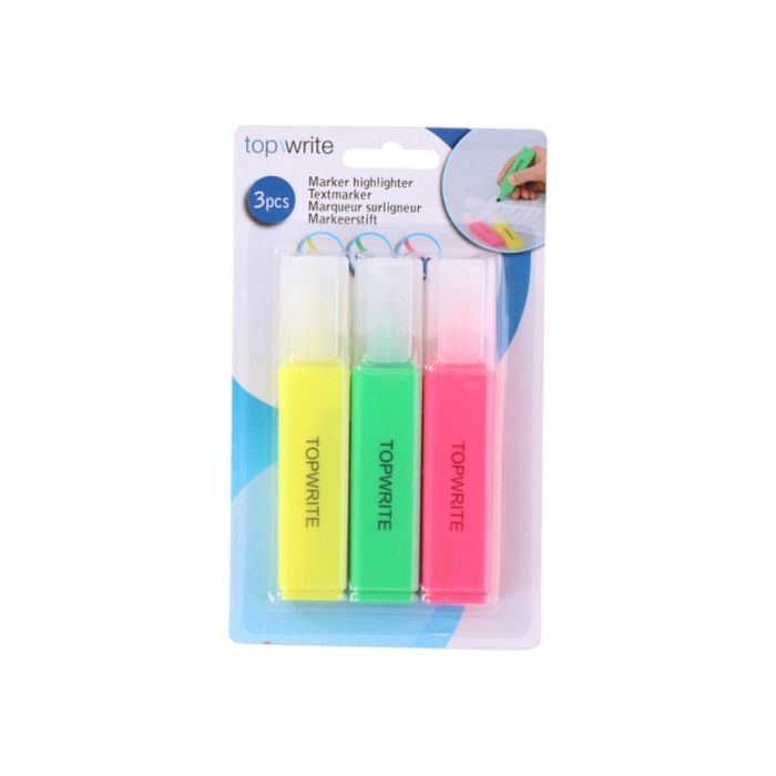 Set van drie Topwrite markeerstiften, in de kleuren groen, geel en roze .