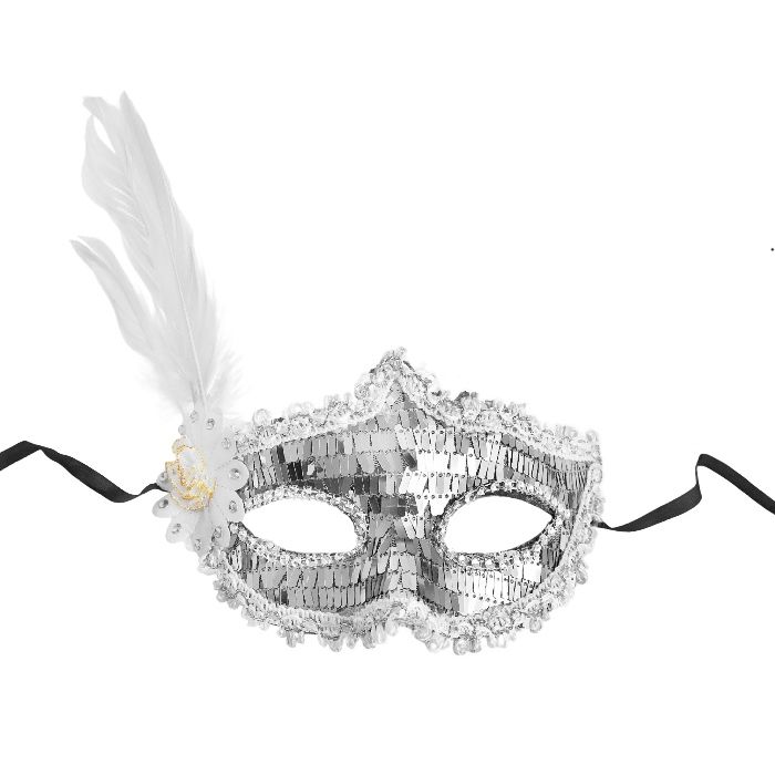 Prachtige zilveren masker met pailletten en veren.