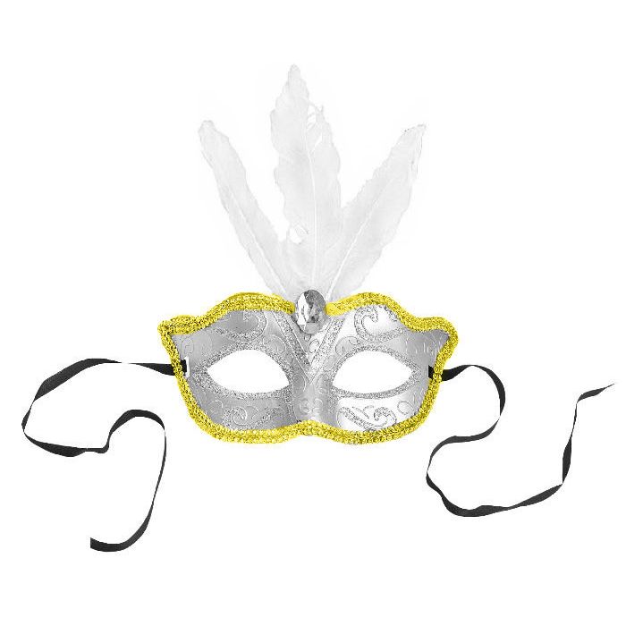 Mooie zilveren/witte masker met een sierlijke glitter look en drie grote veren. De afmetingen van het masker (excl. versiering) zijn 18 x 8 cm (BxH). Met versiering is het masker ca. 18 x 24 cm groot (BxH).