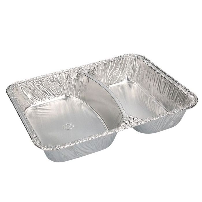 Aluminium schalen/bakken met 2 vakken. Deze menubakken zijn ideaal voor het meenemen of bezorgen van warme gerechten. Aluminium zorgt voor een goede isolatie waardoor de inhoud lang op temperatuur kan blijven. Een menubak heeft een afmeting van 22x17,5x3cm (lxbxh). Een verpakking bevat 20 bakjes. Deksels zijn inbegrepen.