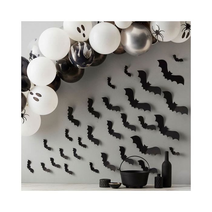 Voor een echt griezelig stukje Halloween-wanddecoratie, zal onze vleermuis-wanddecoratie zeker de kriebels bezorgen. Deze zwarte vleermuizen zijn verkrijgbaar in drie verschillende maten en creëren het effect van een zwerm die wordt vrijgelaten uit een griezelig spookhuis. De vleermuizen kunnen met de meegeleverde low tack-stickers op oppervlakken worden geplakt. Elk pakket bevat 30 vleermuizen met verschillende spanwijdten (10 x grote spanwijdte van 30 cm, 10 x middelgrote spanwijdte van 20 cm en 10 x kleine spanwijdte van 12 cm) en 30 x stickers met lage kleefkracht op een apart vel in 3 maten.