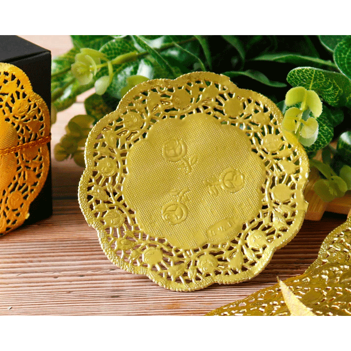 Ronde papieren onderleggers met goudfolie en kant patroon voor het presenteren van bijvoorbeeld gebakjes. Ook handig om bedankjes mee te decoreren. Een onderlegger heeft een doorsnede van 8,5 cm en is verpakt per 20 stuks.