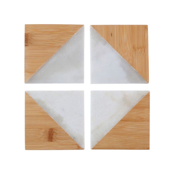 Prachtige rechthoekige onderzetters van marmer en bamboe. In een set zitten vier onderzetters. De onderzetters zijn 10x10cm groot.