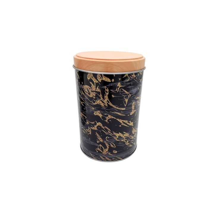 Mooie bewaarblik met een deksel, voorzien van een decoratieve zwart & goud marmer print, waar je allerlei etenswaren in kunt opbergen zodat deze langer vers blijven. De ronde opbergblik heeft een afmeting van 13,5 (h) x 9 (d) cm.
