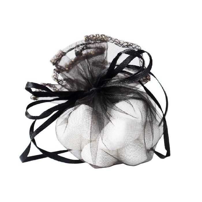 Ronde organzazak in de kleur zwart. Deze ronde organzazak met lint heeft een diameter van 24 cm. Door aan het lint te trekken wordt het platte stuk stof een mooi bol zakje. Per 12 verpakt.