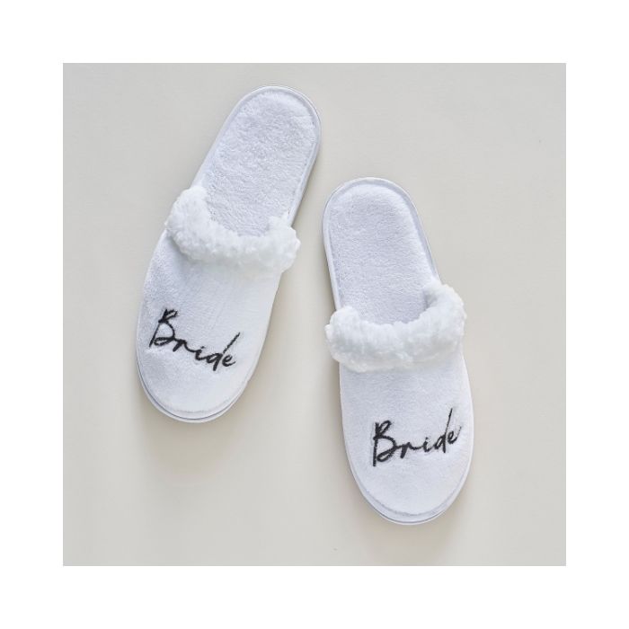 Optimaal comfort tijdens de voorbereidingen voor je grote dag of vrijgezellenfeest is gegarandeerd met deze pluizige 'Bruid' pantoffels van Ginger Ray. In stralend wit met elegant zwart geborduurde 'Bruid', passen ze perfect bij elke bruidsjurk of pyjama. Ook een geweldige toevoeging aan je 'post-vrijgezellenfeest' herstelkit. Deze pantoffels in one size zijn niet alleen heerlijk zacht, maar vormen ook een blijvende herinnering aan jouw speciale momenten voor het altaar. Verwen jezelf of geef ze als cadeau aan de toekomstige bruid voor een vleugje plezier en comfort op haar grote dag!