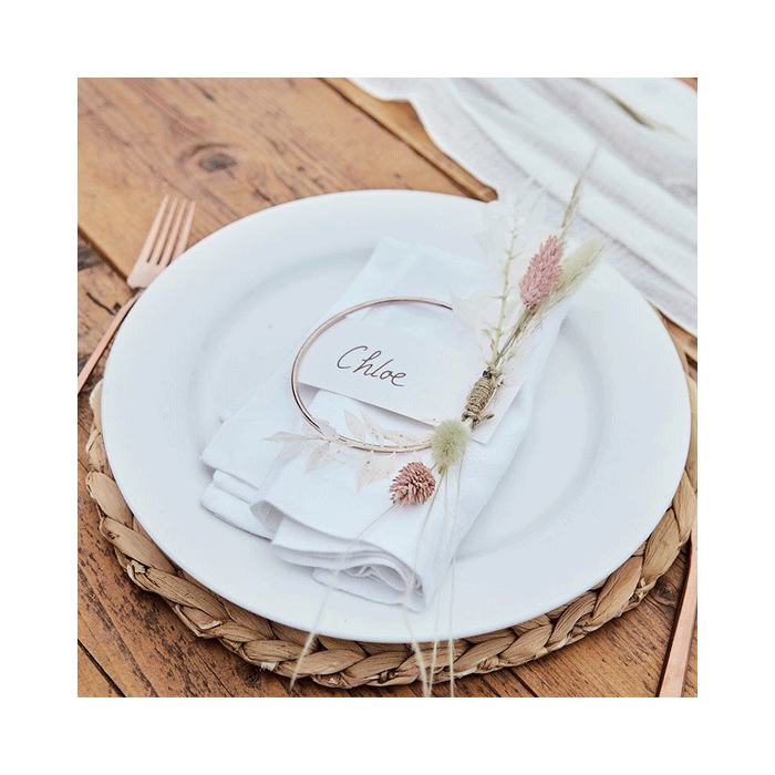 Kleed je tafel in stijl aan met deze elegante roségouden ringen en plaatskaarten. Bevestig een takje met bladeren of een selectie droogbloemen (niet inbegrepen) voor de ultieme rustieke look. Elke set bestaat uit vier witte plaatskaarten (11x5cm), vier roségouden hoepels (10cm) en 4 stukken draad voor eenvoudige montage.