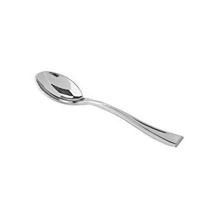 Stevige plastic mini lepels in de kleur zilver. De lepels hebben een uitstraling van metalen bestek, ideaal voor feesten zoals huwelijken, speciale diners en verjaardagen. De lepels zijn 10 cm lang. Een pak bevat 24 lepels.