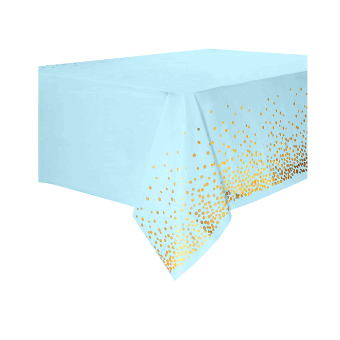 Plastic tafelkleed in het blauw met gouden dots. Perfect voor feestjes en andere gelegenheden. Tip: de tafelkleed is herbruikbaar!