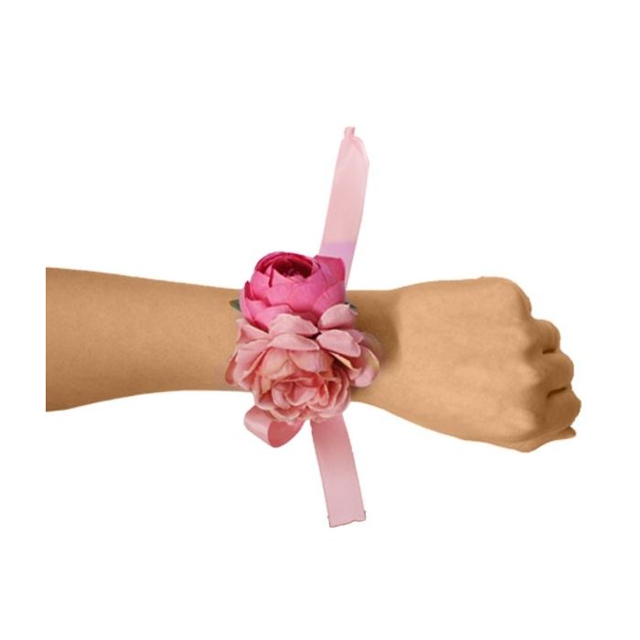 Mooie stoffen polscorsage. Het corsage is in zijn geheel 65 cm lang. Het bebloemde deel is 7cm lang en 6cm breed. Leuk voor de bruidsmeisjes of gasten van een babyshower!