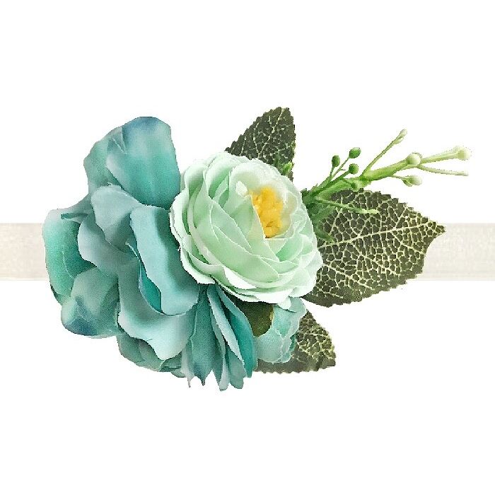 Witte polscorsage met kunst pioenrozen in turquoise kleur, groene bladeren, parels en lint van organza. Het bebloemde deel is 9,5cm lang en 8cm breed. Leuk voor de bruidsmeisjes of gasten van een babyshower!