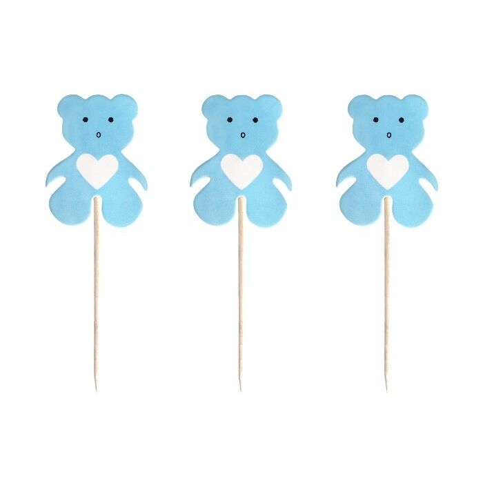 Schattige cupcake prikkertjes met een blauw beertje aan de bovenkant, gemaakt van papier. De prikkers zijn 12,5cm lang en zijn verpakt per 12 stuks.