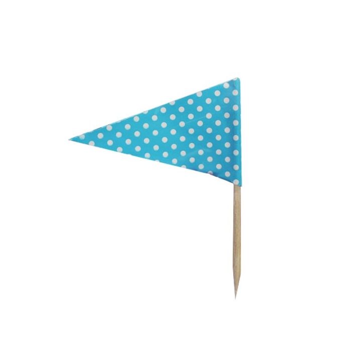 Cocktailprikkers met blauw/wit gestippelde puntvlag. Eén verpakking bevat 24 prikkers.