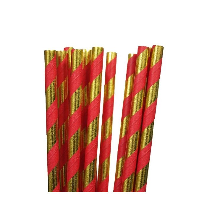 De funky kartonnen rietjes zijn duo gemixt van kleur: metallic goud met rood. De rietjes zijn 19,5cm lang en verpakt per 12 stuks.