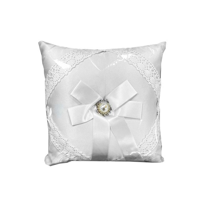Satijnen ringkussen met een strikje en parel/strass decoratie. De ringkussen heeft een afmeting van 15 x 15 cm.