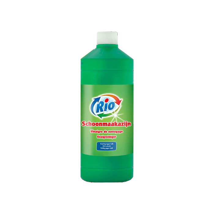 RIO schoonmaakazijn is het reinigingsmiddel voor het verfrissen, ontkalken en ontvetten van o.a. ramen, huishoudelijke apparaten, pannen, sanitair en kleding. Volg voor het ontkalken van uw huishoudelijke apparaten de voorschriften van de fabrikant. Niet geschikt voor bereiden met voedsel.