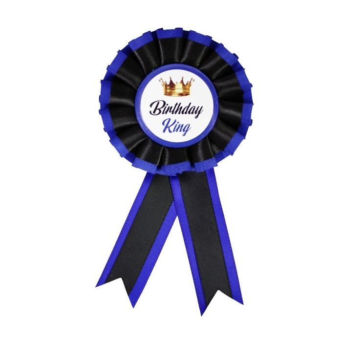 Rozet met de tekst: Birthday King. Spelt deze rozet op zodat iedereen weet dat je jarig bent! De rozet heeft een diameter van 8 cm met twee slierten lint van max. 10 cm als aanhangsel.
