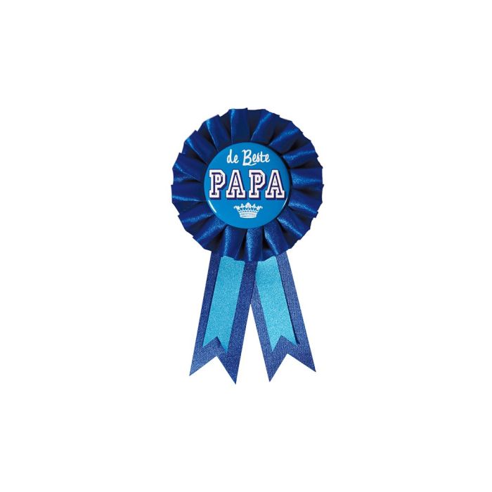 Rozet met de tekst 'de Beste PAPA'. De rozet heeft een diameter van 7,8 cm met 3 slierten lint van max 8,5 cm als aanhangsel.
