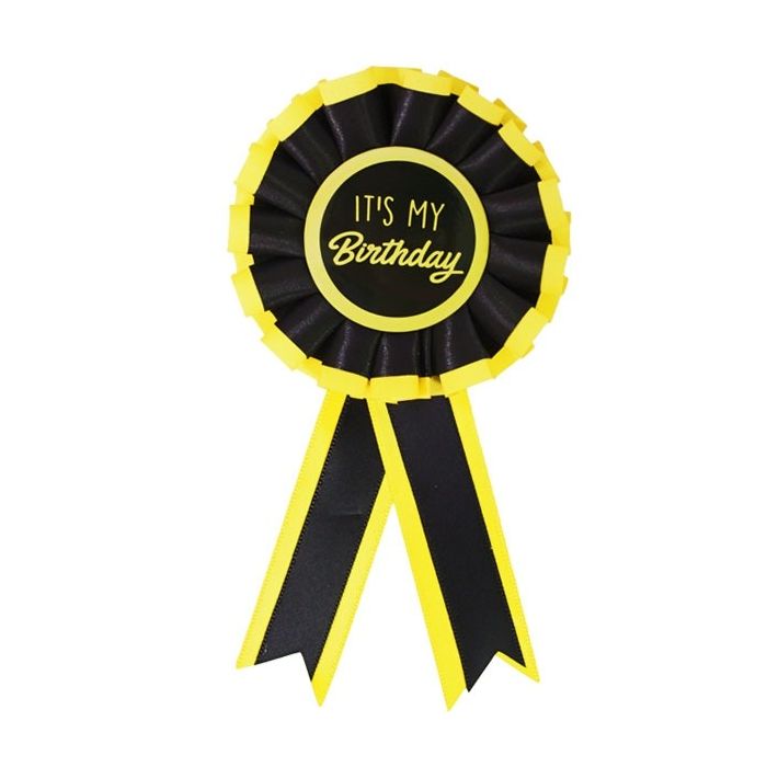 Rozet met de tekst: It's My Birthday. Spelt deze rozet op zodat iedereen weet dat je jarig bent! De rozet heeft een diameter van 8 cm met twee slierten lint van max. 10 cm als aanhangsel