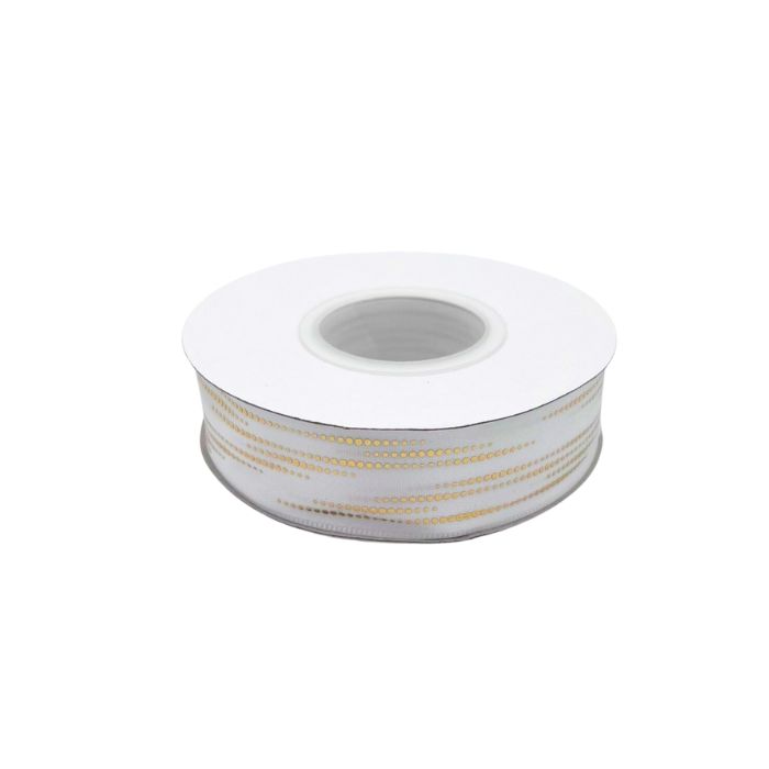 Luxe wit satijnlint met stippen in metallic goud. Dit lint is 22 meter lang en heeft een breedte van 2,5 centimeter. Het is uitermate geschikt voor het inpakken van cadeautjes en voegt een luxueuze uitstraling toe aan het geheel.