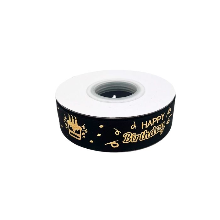 Luxe zwart satijnlint met de tekst 'Happy Birthday' en een print van een taart in metallic goud. Dit lint is 22 meter lang en heeft een breedte van 2,5 centimeter. Het is uitermate geschikt voor het inpakken van cadeautjes en voegt een luxueuze uitstraling toe aan het geheel.