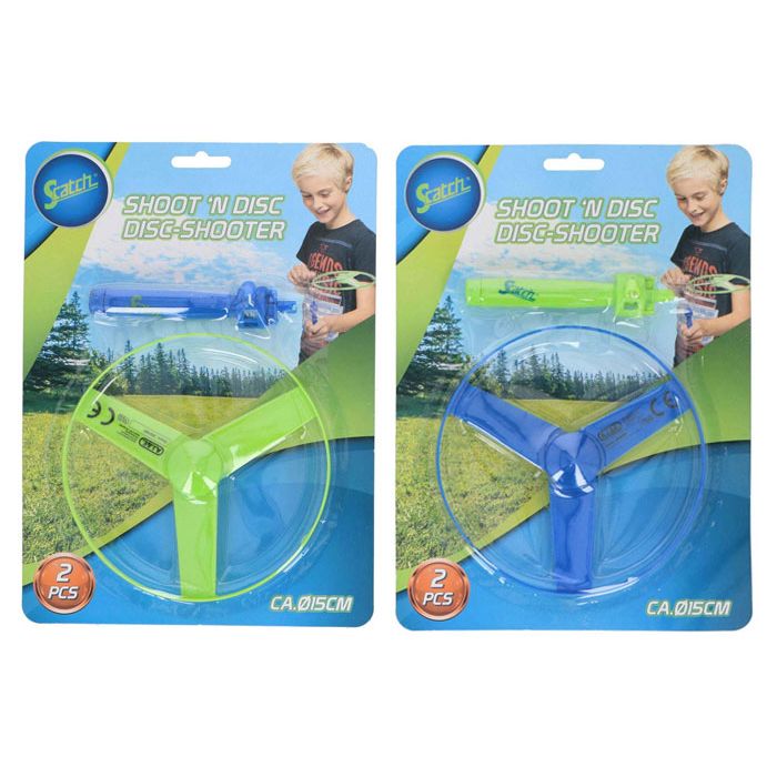 Plaats de schijf op de schijfschieter en druk op de knop. De schijf schiet de lucht in! Hoe ver kan jij de schijf laten vliegen? De schijf heeft een doorsnede van 15 centimeter. Kleuren worden door elkaar geleverd.
