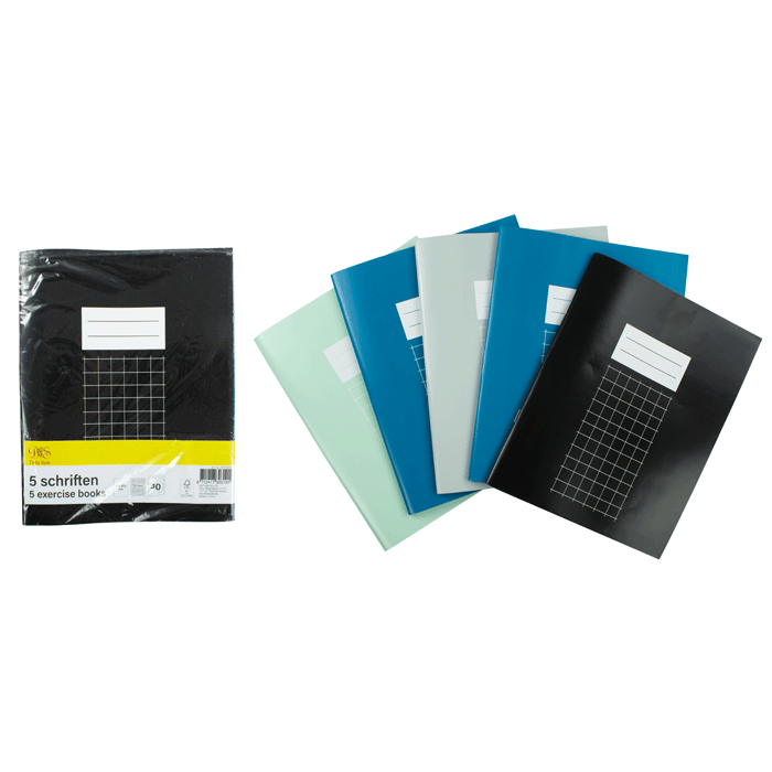 Een set van vijf schriften in A5-formaat in de kleuren zwart, donkerblauw en licht turquoise. Elk schrift heeft 40 pagina's met ruitjes van 1 bij 1 cm en een flexibele kaft.