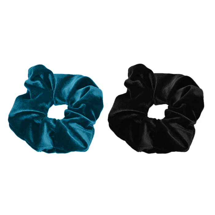 Set van twee scrunchies gemaakt van velvet stof in de kleuren zwart en turquoise. Deze zachte haarelastieken draag je in een knot, staart of gewoon om je pols.