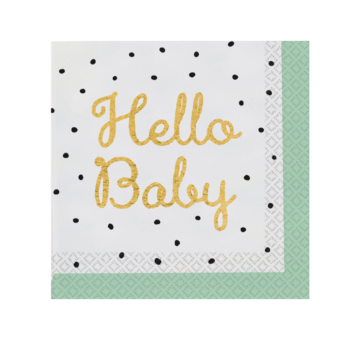 Papieren servetten met een groen randje en de tekst 'Hello Baby' in het goud. Elke verpakking bevat 16 servetten.
