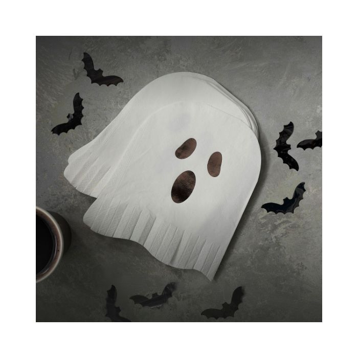 Versier je Halloween tafel met deze leuke spookjes servetten van Ginger Ray. De servetten zijn wit en hebben een zwarte bedrukking, de onderkant van de servetten is voorzien van franjes. Elke verpakking bevat 16 servetten met een afmeting van 16x15cm.