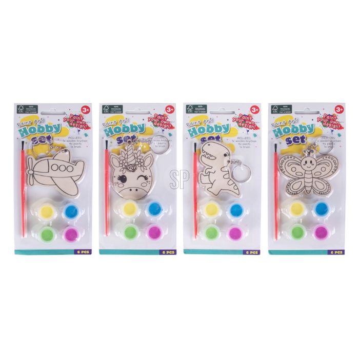 Hobbyset voor het beschilderen van een houten sleutelhanger (vliegtuig, eenhoorn, dino of vlinder). Inclusief 4 kleuren verf en een penseel. Geschikt vanaf 3 jaar. Prijs per stuk, verschillende uitvoeringen/kleuren worden door elkaar geleverd.
