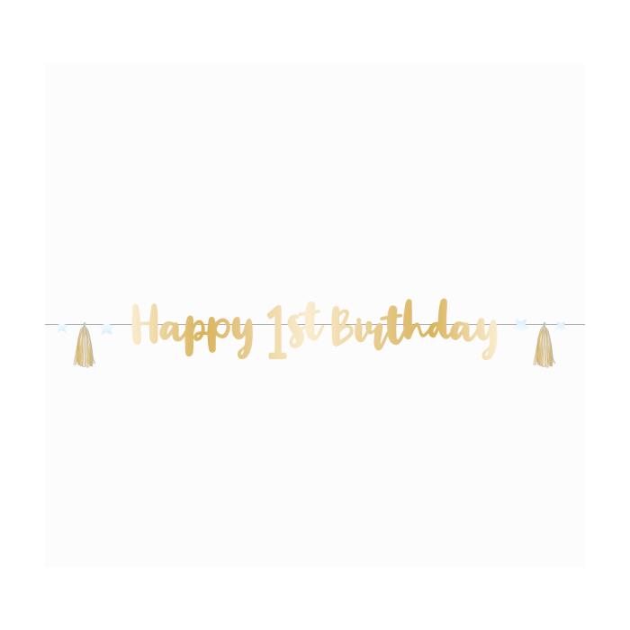 Vier de eerste verjaardag van je kindje met deze mooie letterslinger. De slinger bestaat uit de tekst 'Happy 1st Birthday' in het goud, blauwe sterren en gouden tassels. De slinger is ongeveer 1,8 meter lang.