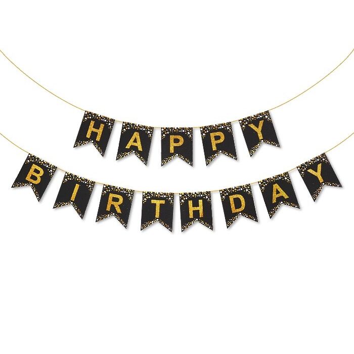 Papieren slinger die de tekst 'Happy Birthday' weergeeft. Een pak bestaat uit 13 losse 'swallowtail vlaggen' en een gekleurd satijnlint van ca 5m lang. Een swallowtail vlag is 16cm breed en 20cm lang. Aan elkaar geregen, is de slinger ca. 2,2m lang.