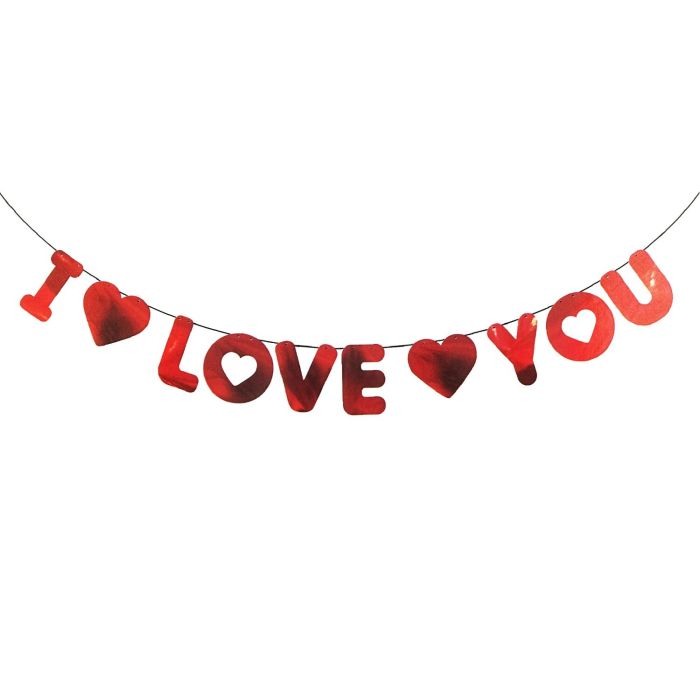 Vier de liefde met elkaar met deze rode I Love You slinger met een glimmende, metallic afwerking. De slinger dient nog zelf in elkaar geregen te worden met het bijgeleverde lint en rijgnaald.