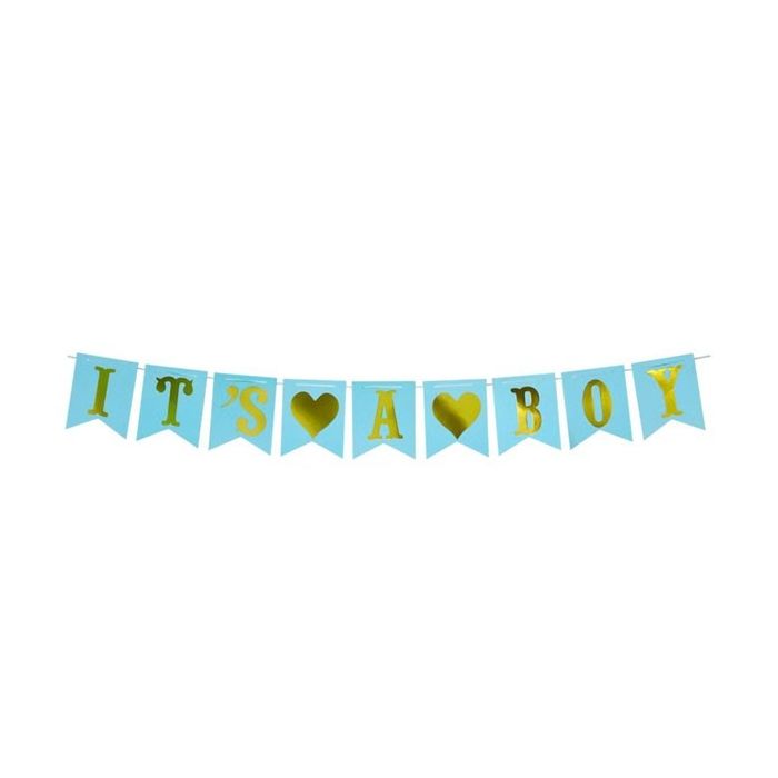 Mooie blauwe papieren slinger met de tekst "It's a boy" in gouden letters. De slinger is gemakkelijk in elkaar te zetten en is in lengte verstelbaar. De afmeting van een "vlaggetje" is 16 x 20 cm. Inclusief lintje.