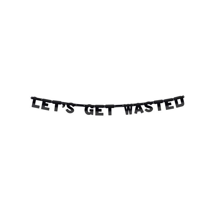 Papieren letterslinger 'Let's get wasted' in zwarte kleur. De slinger is 1,75 meter lang.