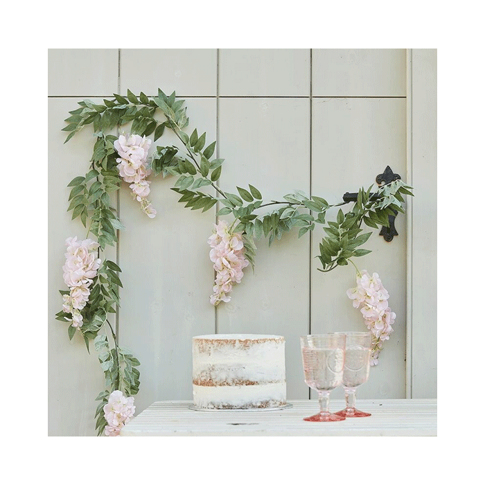 Prachtige slinger van groene bladeren en roze Wisteria bloemen van het merk Ginger Ray. De slinger is ongeveer 1,8 meter lang.