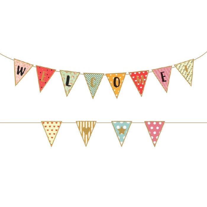 Vrolijke kartonnen slinger met de tekst Welcome!. De slinger dient nog in elkaar geregen te worden. Satijnlint (ca. 3m lang) is inbegrepen.
