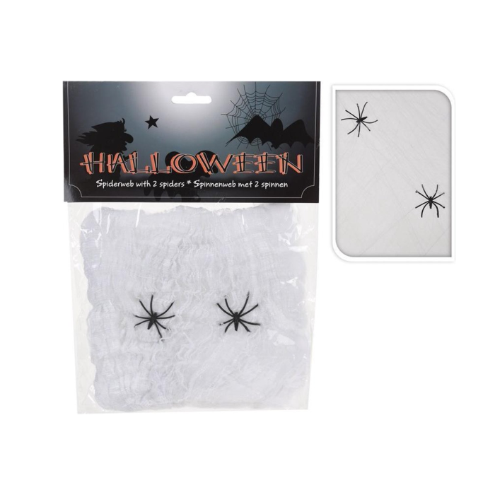 Spinnenweb met 2 spinnen. De spinnen zijn 4cm groot. Leuk te gebruiken voor een Spider-Man feestje of Halloween. Tip: des te meer je het web uitrekt, hoe echter het lijkt.