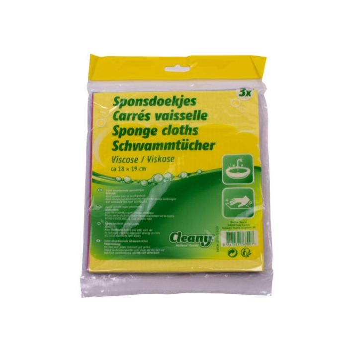 Set van drie sponsdoekjes van Cleany, gemaakt van viscose en met een afmeting van 18 x 19 cm per stuk. Elke verpakking bevat 3 doekjes. Deze handige sponsdoekjes zijn perfect voor allerlei schoonmaakklusjes in huis, zoals het afnemen van oppervlakken, schoonmaken van keukenapparatuur en poetsen van spiegels. De viscose doekjes absorberen water en schoonmaakmiddel goed. Met een verpakking van 3 doekjes heb je altijd een reserve bij de hand. Maak het huishouden gemakkelijker en milieuvriendelijker met deze praktische Cleany sponsdoekjes!